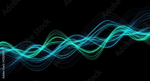 Naklejka premium audio waveform, neon blue, electric, oscilloscope display, digital sound visualization, glowing energy, black background, horizontal line, dynamic waves, electronic music, synthetic, futuristic, abstr