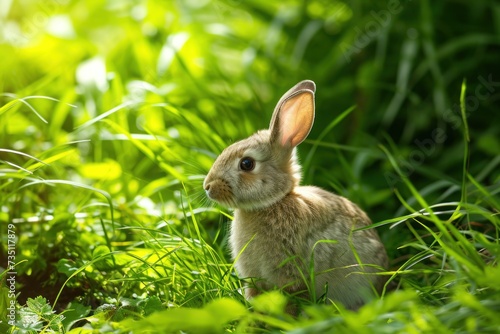 Fototapeta premium Audubons Cottontail rabbit sitting in grass, gazing at camera