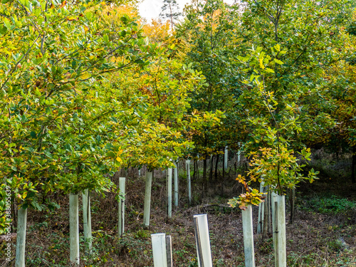 Fototapeta premium Aufforstung im Mischwad, junge Laubbäume in Wuchshüllen