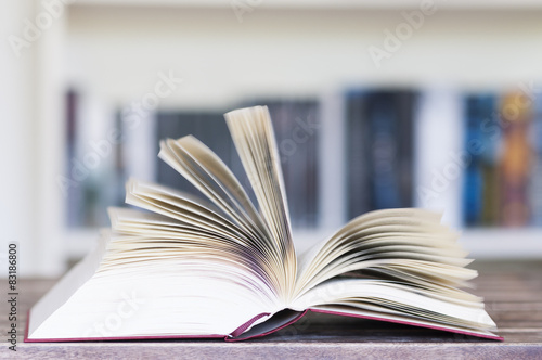 © ub-foto, Fototapeta premium Aufgeschlagenes Buch vor Buecherregal