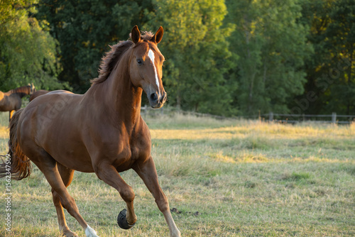 © mavcon, Fototapeta premium aufmerksames Pferd mit langer Blesse galoppiert entspannt im Sommer von links ins Bild