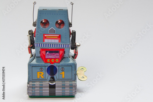 Fototapeta premium Aufziehbarer retro Spielzeug Roboter aus Blech vor neutralem Hintergrund