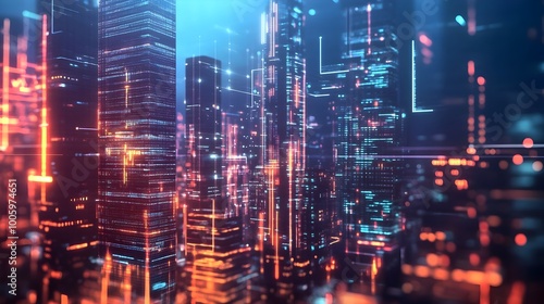 Fototapeta premium Augmented Reality Business Presentation featuring Glowing Holographic Data Visualizations and a Corporate Skyscraper Backdrop Futuristic Technology for Finance Research and Analytics Insights