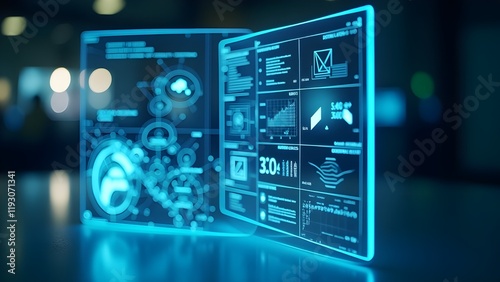 © JohnnyMohAzar, Fototapeta premium Augmented reality interface displaying information on a smart glass screen