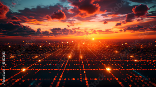 Obraz premium Augmented reality wallpaper landscape at sunset visualizing future tech...