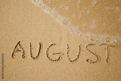 © De Visu, Fototapeta premium August - handwritten on the soft beach sand.