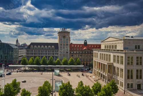 Naklejka premium Augustusplatz Leipzig mit Krochhochhaus und Oper, Stadtansicht bei dramatischem Wolkenhimmel, Architektur und Urbanes Leben, Krochhochhaus mit Glockenspiel in Leipzig, Sachsen, Deutschland