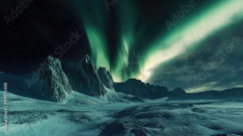 © Matcha_09, Naklejka premium Aurora australis lighting up the polar night sky over icy terrain