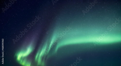 Naklejka premium Aurora borealis illuminates the night sky with mesmerizing green hues amidst a backdrop of twinkling stars.