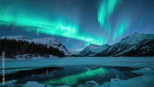 Naklejka premium Aurora Borealis Illuminating a Snowy Mountain Landscape Over a Frozen Lake