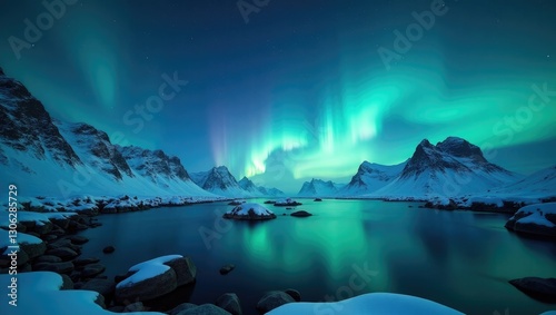 © Seyyar, Naklejka premium Aurora borealis illuminating snow-laden peaks in the Lofoten archipelago, Norway. Starry heavens showcase polar lights reflected on the water, creating a serene winter night scene with snowy terrai...