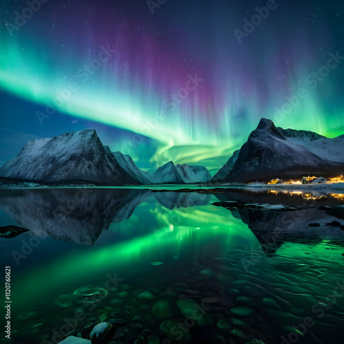 © Galih, Naklejka premium Aurora borealis in the Lofoten archipelago, Norway. Night sky with polar light. Winter landscape at night with aurora and reflection on water surface