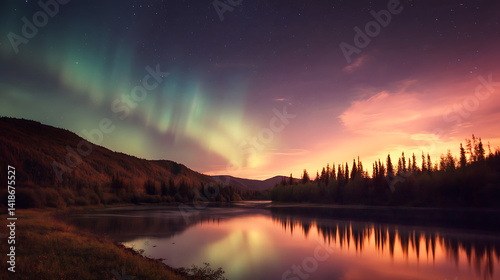 © THIBNH, Obraz premium Aurora borealis, northern lights above forest. Night sky with polar lights. Night winter landscape with aurora and reflection on the water