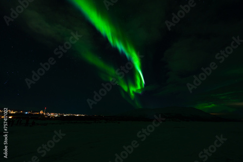 Naklejka premium Aurora Borealis - Northern lights - above frozen lake Tornetrask in Abisko,...
