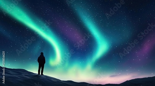 © Jiraporn, Fototapeta premium Aurora borealis northern lights concept. A mesmerizing view of the aurora borealis illuminating the night sky.