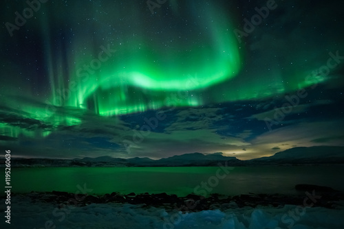 Naklejka premium Aurora borealis northern lights, lapland, Winter landscape Majestic northern lights dance in starry sky