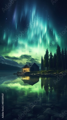 © A to Z, Fototapeta premium Aurora Borealis Northern Lights over log cabin in winter.