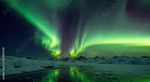 © Strive Studio, Naklejka premium Aurora borealis over a snowy landscape with water reflection at night.