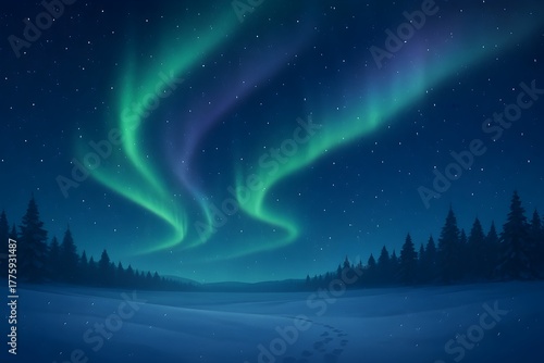 © Armansyah, Fototapeta premium Aurora Borealis over a Winter Forest Landscape
