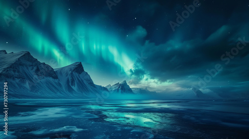 Naklejka premium Aurora borealis over ocean. Starry sky with polar lights and clouds. Night winter landscape with aurora, sea with blurred water, snowy mountains