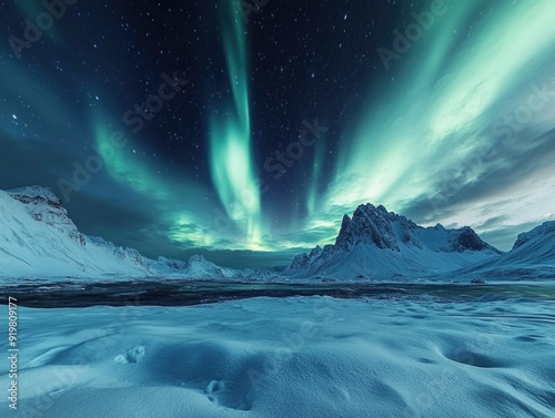 © Alexandr, Naklejka premium Aurora borealis over snowy landscape