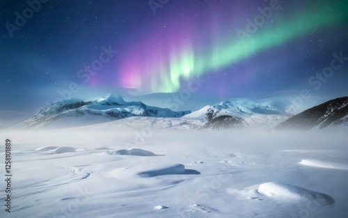 Naklejka premium Aurora Borealis Over Snowy Mountains: A breathtaking display of the aurora borealis paints the night sky with vibrant colors above a majestic snow-covered mountain range.