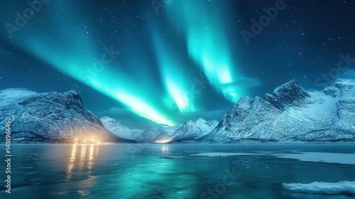Naklejka premium Aurora Borealis over Snowy Mountains and Frozen Lake
