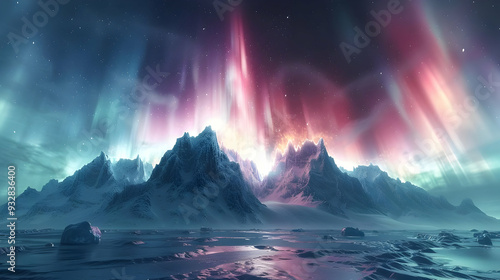 Fototapeta premium Aurora Borealis Over Snowy Mountains - 3D Illustration