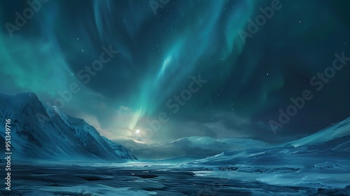 Fototapeta premium Aurora borealis over snowy mountains in winter