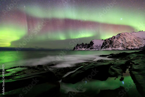 © Olga, Naklejka premium Aurora borealis over the Ersfjord Beach. Senja island at night, Europe Senja island in the Troms region of northern Norway. Long exposure shot.