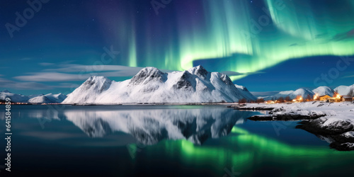 © Sasint, Naklejka premium Aurora borealis over the sea, snowy mountains and city lights at night. Northern lights in Lofoten islands, Norway. Starry sky with polar lights. Winter landscape with aurora, reflection, sandy beach