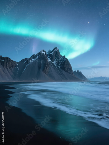 Naklejka premium Aurora Borealis Over Vestrahorn Mountain with Black Sand Beach