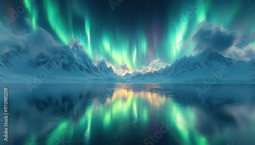 © Alienmarsh, Naklejka premium Aurora Borealis Reflecting on a Frozen Lake