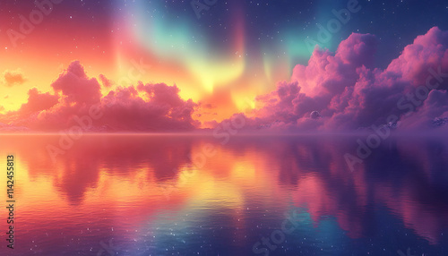 Naklejka premium Aurora borealis reflection, colorful sunset sky, calm sea, starry night,...
