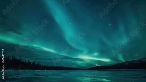 © 果果 郭, Fototapeta premium Aurora Borealis Wallpaper: Glowing Green & Blue Northern Lights Over Arctic Night Sky