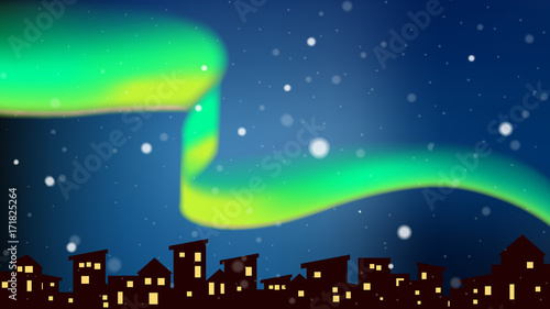 © momosama, Fototapeta premium Aurora dancing above city at night with snowfall
