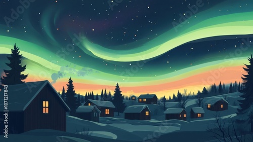 Fototapeta premium Aurora's Embrace: Nordic Village Serenity