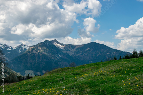© Deniz, Fototapeta premium Ausblick auf die Berge und blauem Himmel mit einer Wiese im Vordergrund