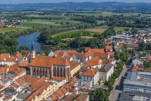 © ARochau, Obraz premium Ausblick auf die Stadt Straubing an der Donau in Niederbayern im Sommer