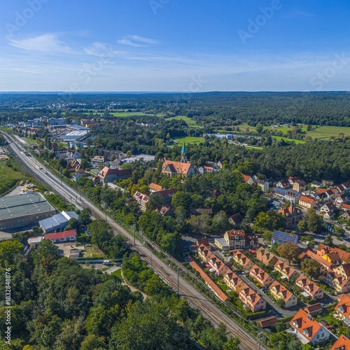 © ARochau, Fototapeta premium Ausblick von oben ins Tal der Pegnitz bei Röthenbach im Nürnberger Land in Mittelfranken