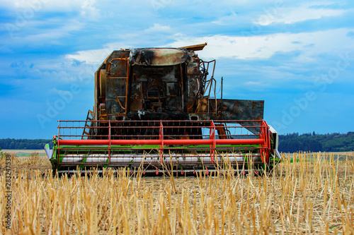 © Alex T., Fototapeta premium Ausgebrannter Mähdrescher auf einem Feld