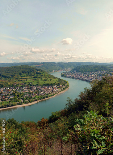© Philipp, Fototapeta premium Aussicht Richtung Boppard von der sogenannten Bopparder Hamm, im UNESCO-Welterbe Oberes Mittelrheintal Rheinland-Pfalz. Blick vom Aussichtspunkts Gedeonseck.