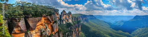 © Olena, Fototapeta premium Australia Blue Mountains Panorama. Majestic Cliff Formations in Dramatic Blue Environment