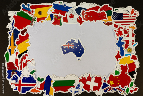 © GreenThumbShots, Obraz premium Australia Map Filled with Flag Color Surrounded by International Country Map Flags
