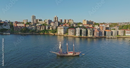 Obraz premium Australia, Sydney: Aerial drone revealing Sydney's skyline with a traditional sailing ship navigating the harbor, blending modern architecture and maritime heritage. Aerial view drone