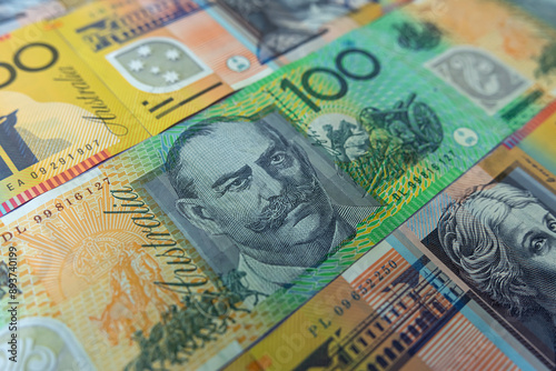 © RomanR, Fototapeta premium 50 100 Australian currency AUD dollars bills banknotes. Polymer banknotes