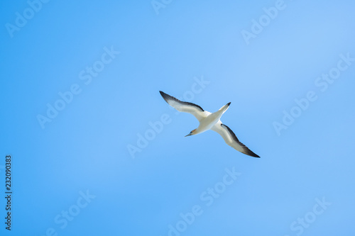 Obraz premium Australian Gannet bird flying over the blue sky.