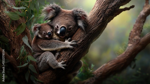 © zidna, Fototapeta premium Australian Koalas Mother and Joey Embrace on Tree Branch in Forest