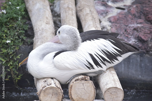 © Octa, Obraz premium Australian pelican (Pelecanus conspicillatus) is a large waterbird in the family Pelecanidae. It is a predominantly white bird with black wings and a pink bill. Potrait.