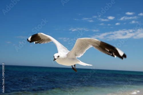 Obraz premium Australian Seagull Chroicocephalus novaehollandiae flying at Indian Ocean, Western Australia